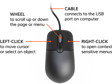 The computer mouse (also called pointing device) is an important tool used to communicate with your computer. This tool allows you to point to objects on the computer screen, click and select them, or move them. The mouse is also used to open menu options.